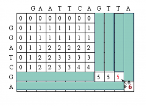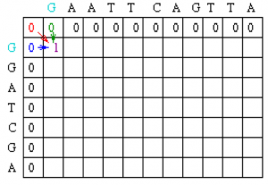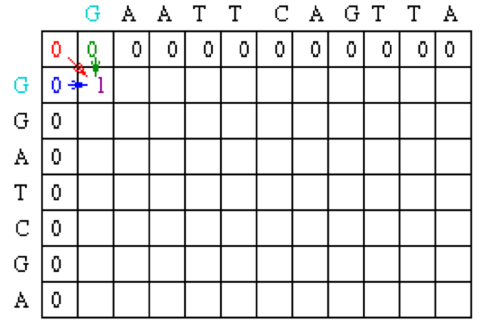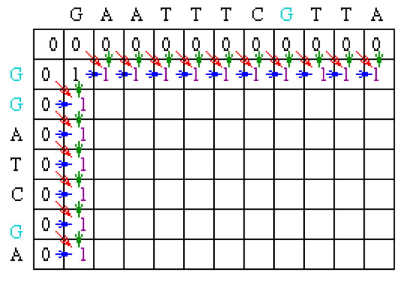 Since the gap penalty (w) is 0, the rest of row 1 and column 1 can be filled in with the value 1. Take the example of row 1. At column 2, the value is the max of 0 (for a mismatch), 0 (for a vertical gap) or 1 (horizontal gap). The rest of row 1 can be filled out similarly until we get to column 8. At this point, there is a G in both sequences (light blue). Thus, the value for the cell at row 1 column 8 is the maximum of 1 (for a match), 0 (for a vertical gap) or 1 (horizontal gap). The value will again be 1. The rest of row 1 and column 1 can be filled with 1 using the above reasoning.