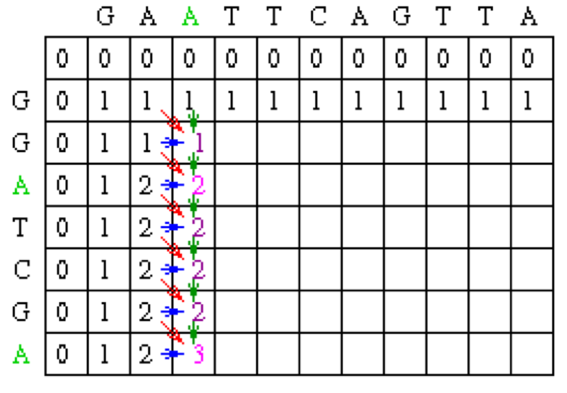 Note that in the example, Mi-1,j-1 will be red, Mi,j-1 will be green and Mi-1,j will be blue.